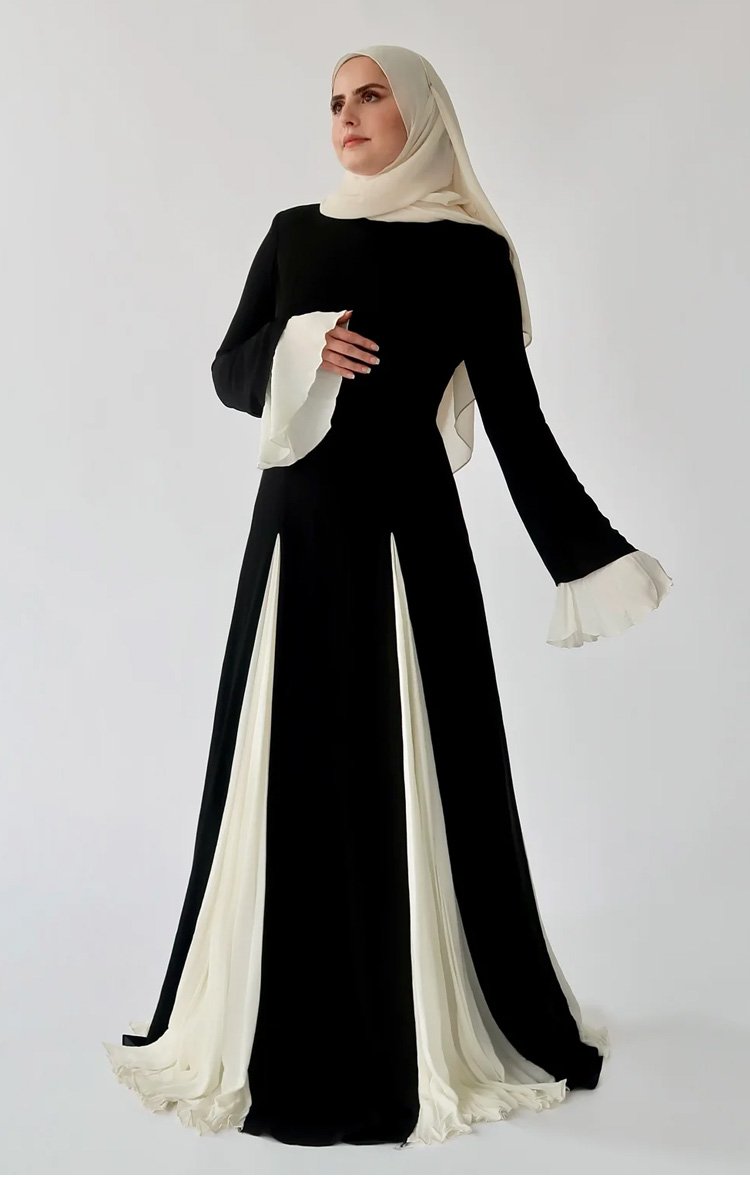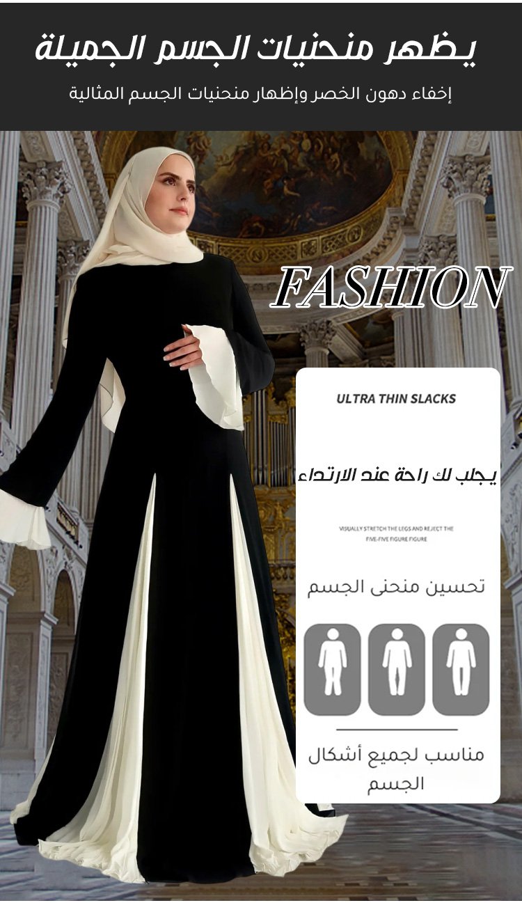 فستان عصري متباين الألوان مع تصميم خصر مشدود بحاشية كبيرة